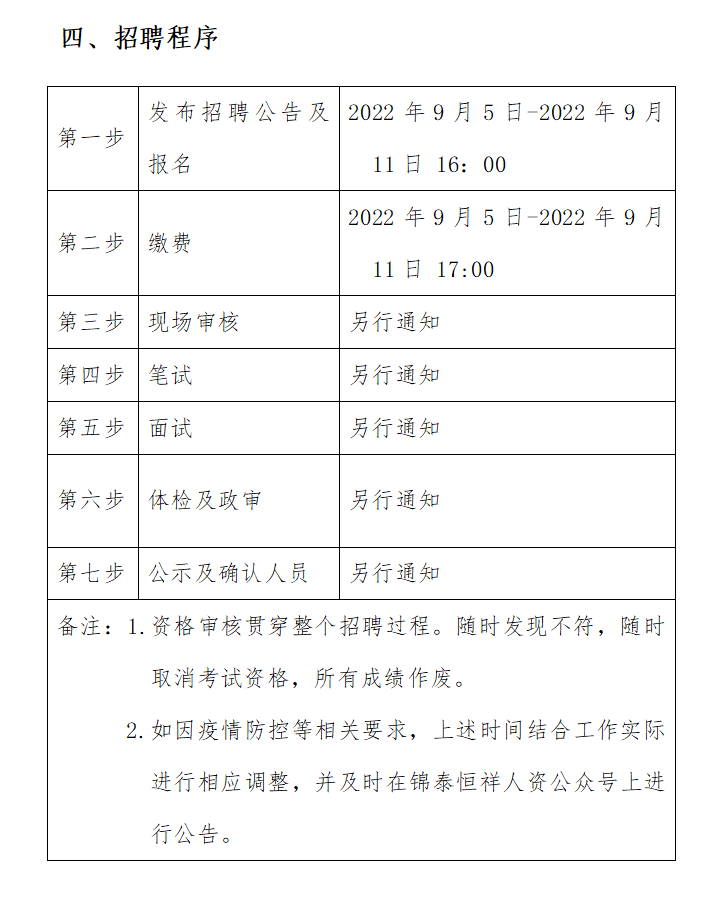 ?2022年9月5日-2022年9月11日16:00 在錦泰恒祥人資官網(wǎng)(www.jthxhr.com)、“錦泰恒祥人力資源服務(wù)有限公司”微信公眾號、“國控集團”官方網(wǎng)站(m.xieekai.com)及上級部門要求的相關(guān)網(wǎng)站等發(fā)布招聘公告。